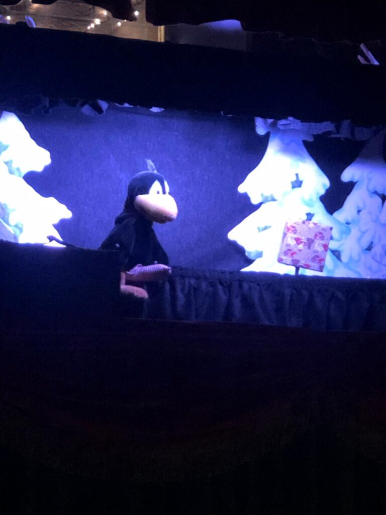 In dem Stück „Alles Weihnachten“ mit dem kleinen Raben Socke geht es darum, dass dieser vergessen hat seinen Wunschzettel rechtzeitig